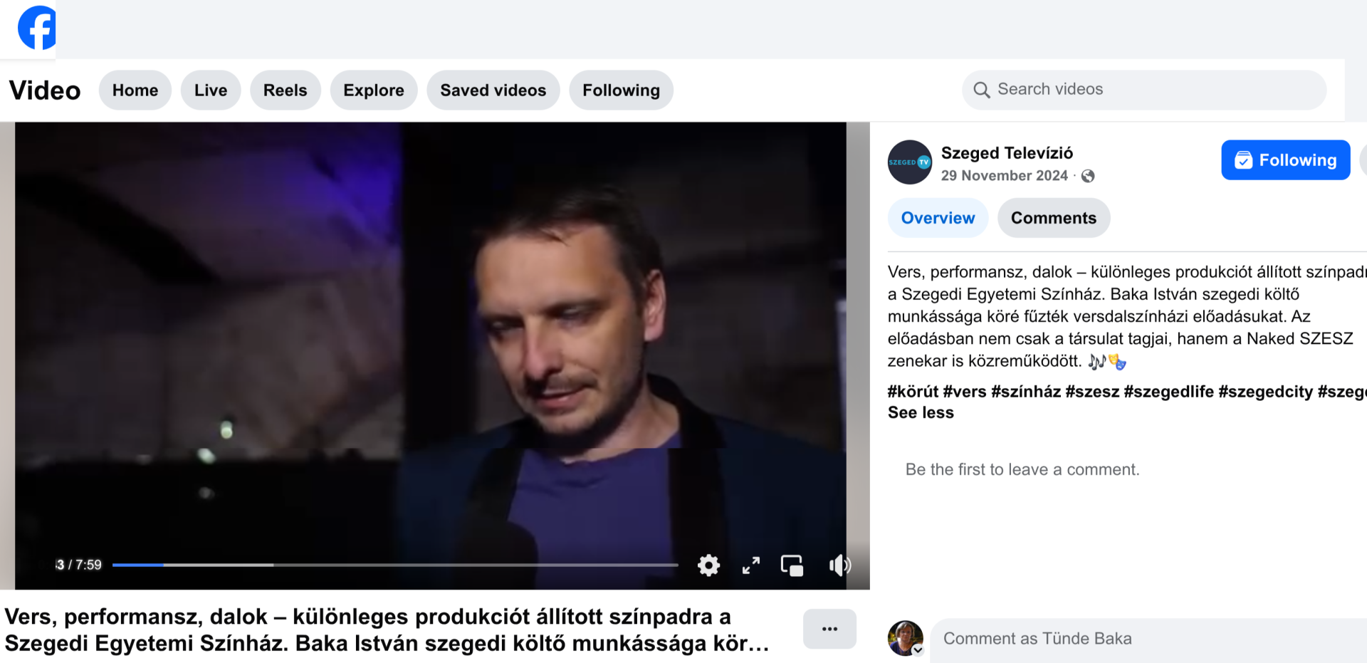 A Szeged Televízió bejegyzése és videója az előadásról egy Facebook-posztban (2024. november 29):