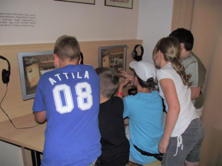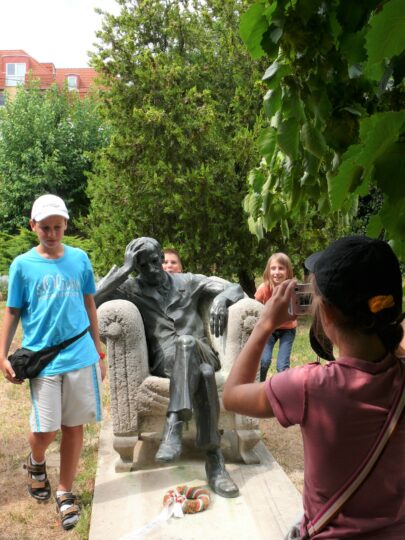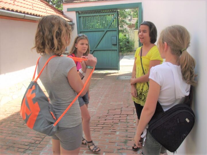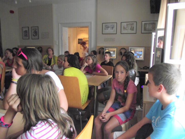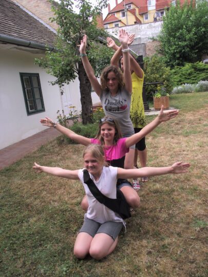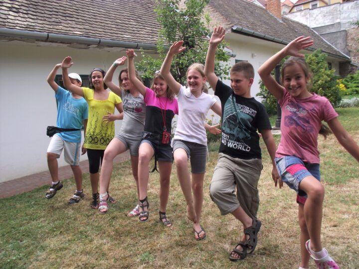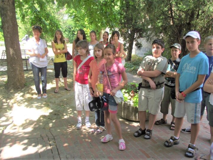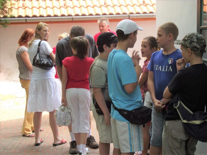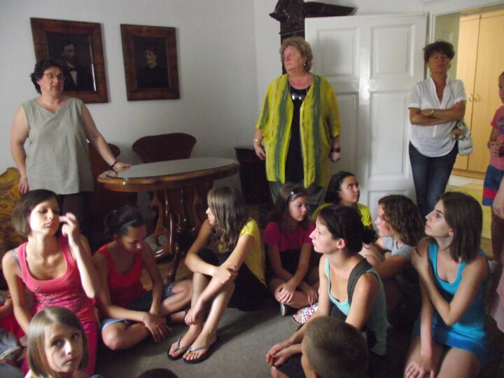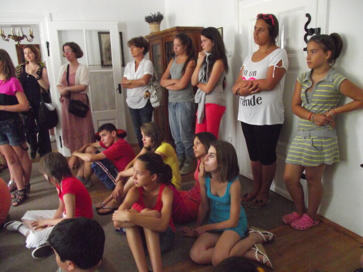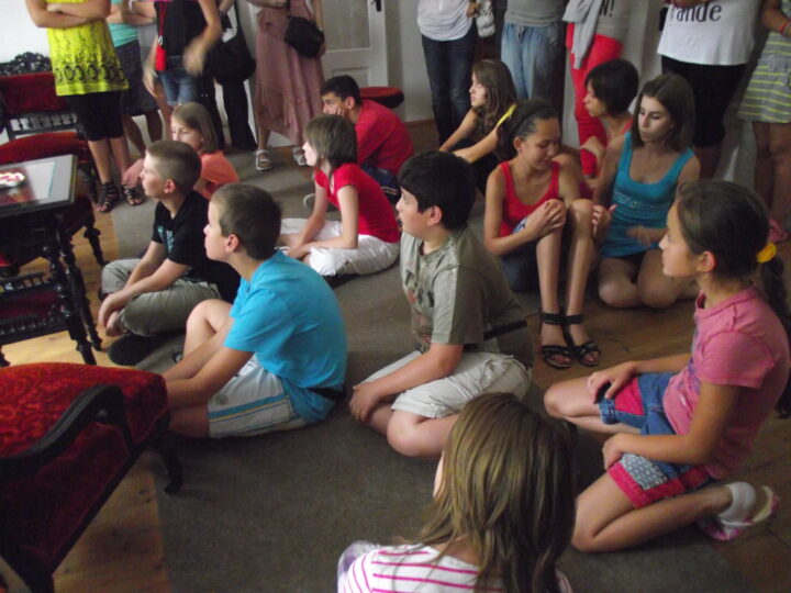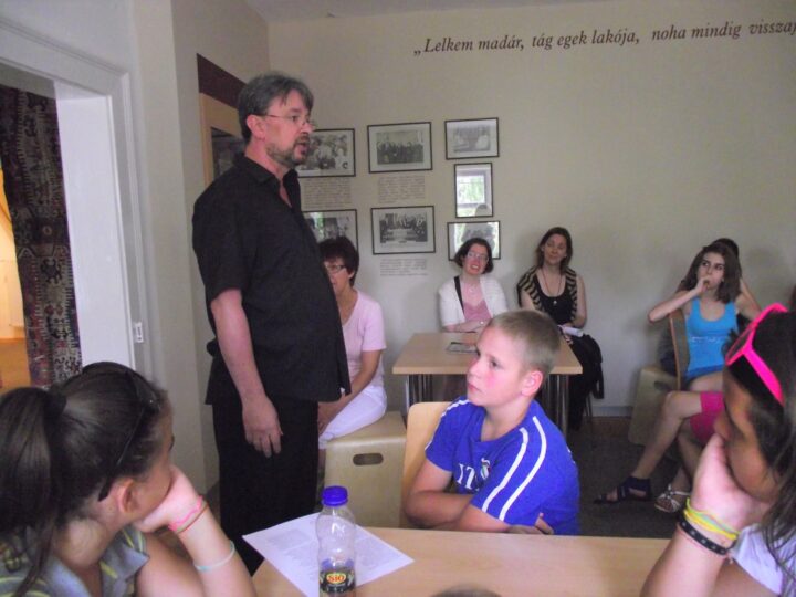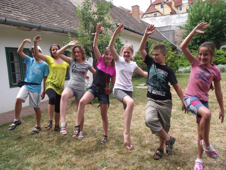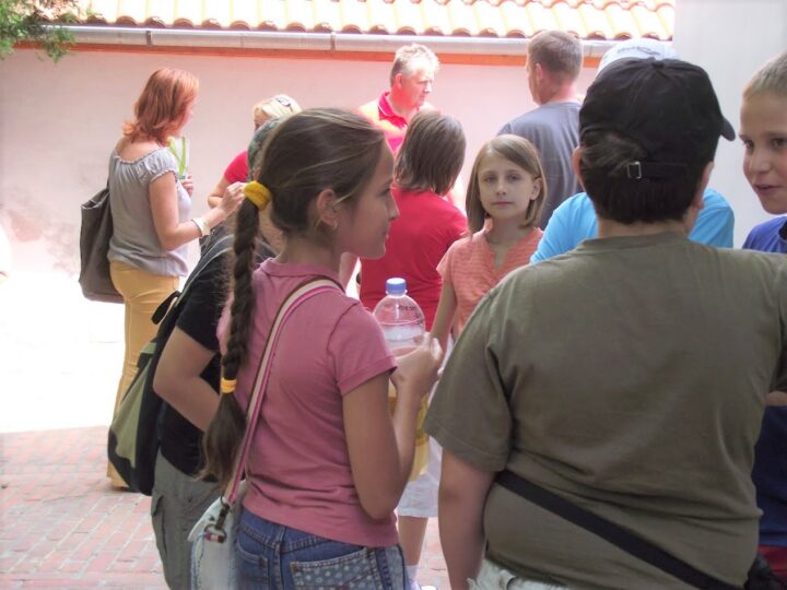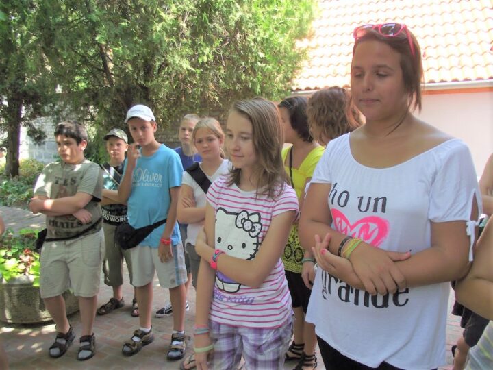 2. A séta után a Babits-ház udvarán találkoztak a szekszárdi és szegedi táborlakók. A gyerekek itt még külön-külön csoportosulnak.
