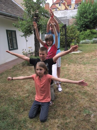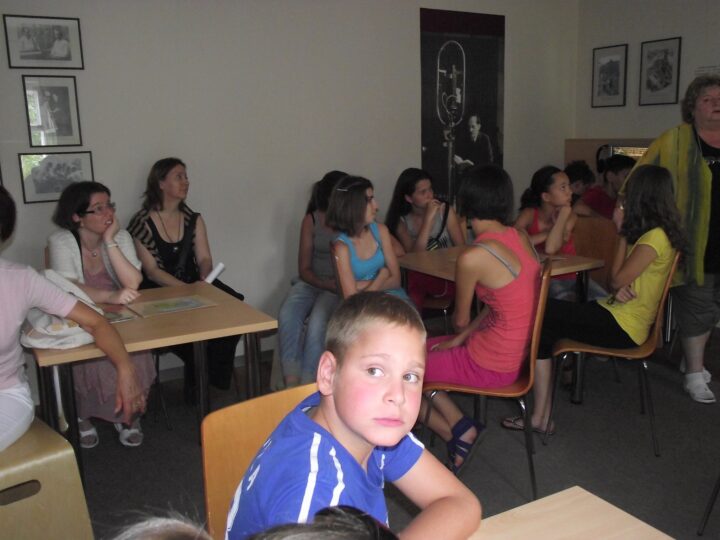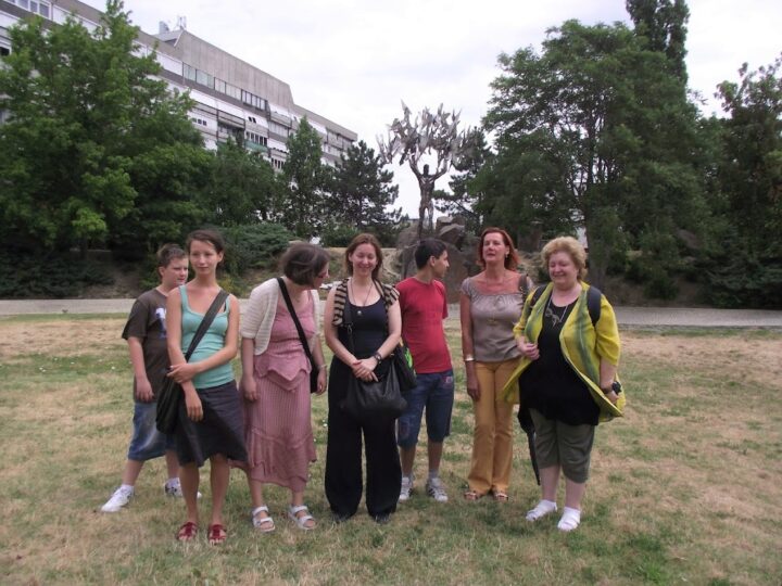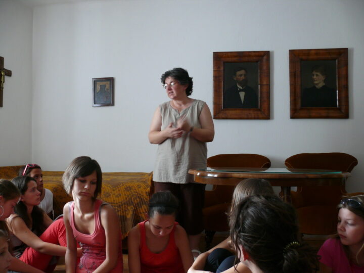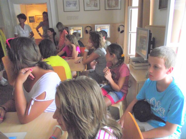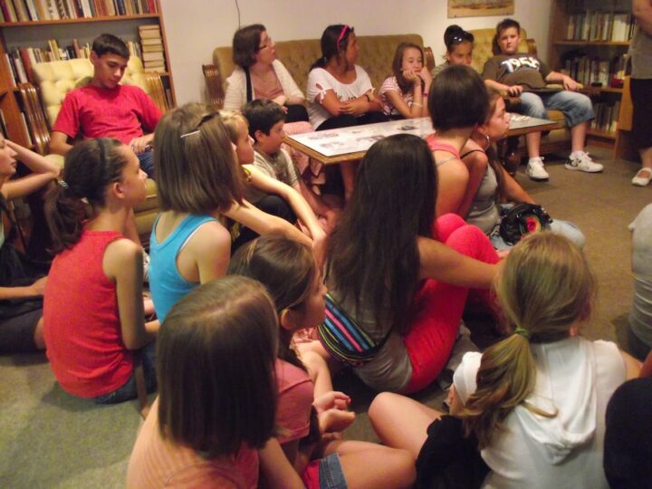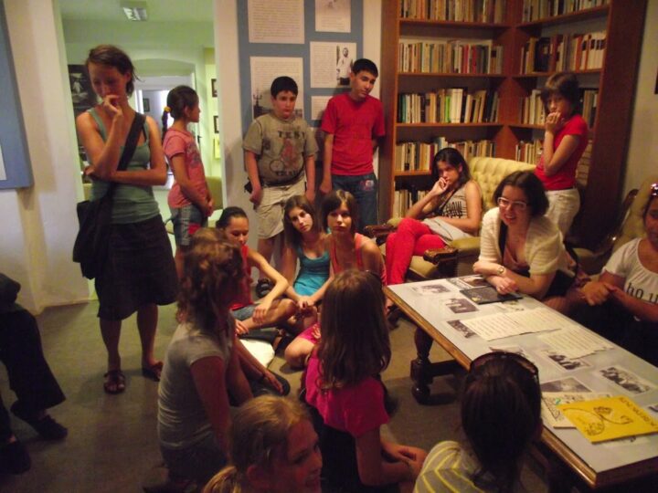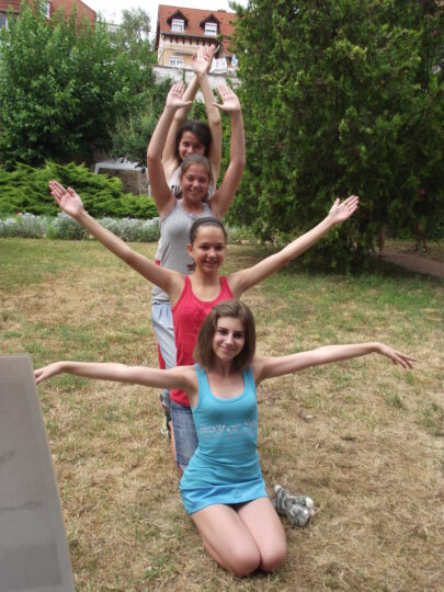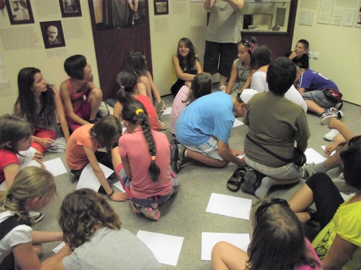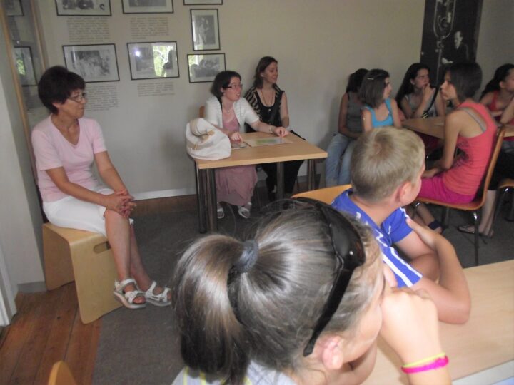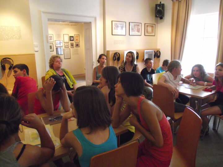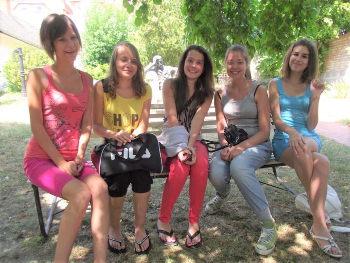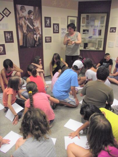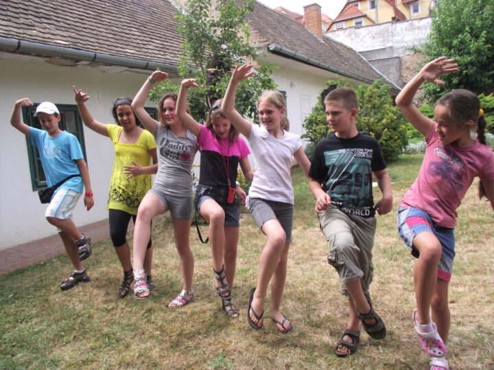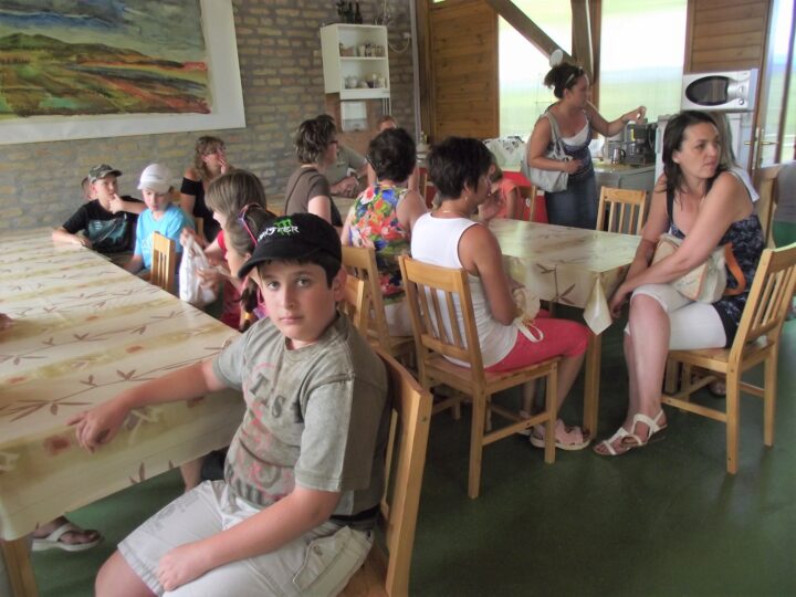 2. A séta után a Babits-ház udvarán találkoztak a szekszárdi és szegedi táborlakók. A gyerekek itt még külön-külön csoportosulnak.