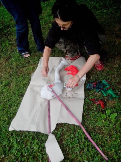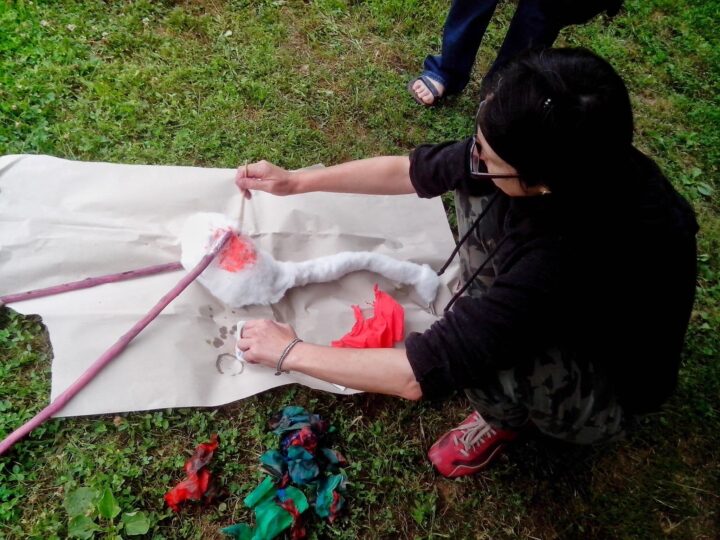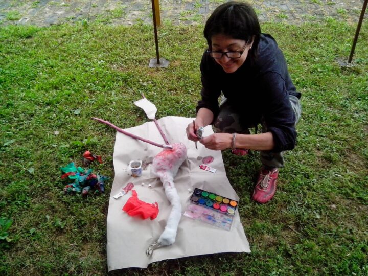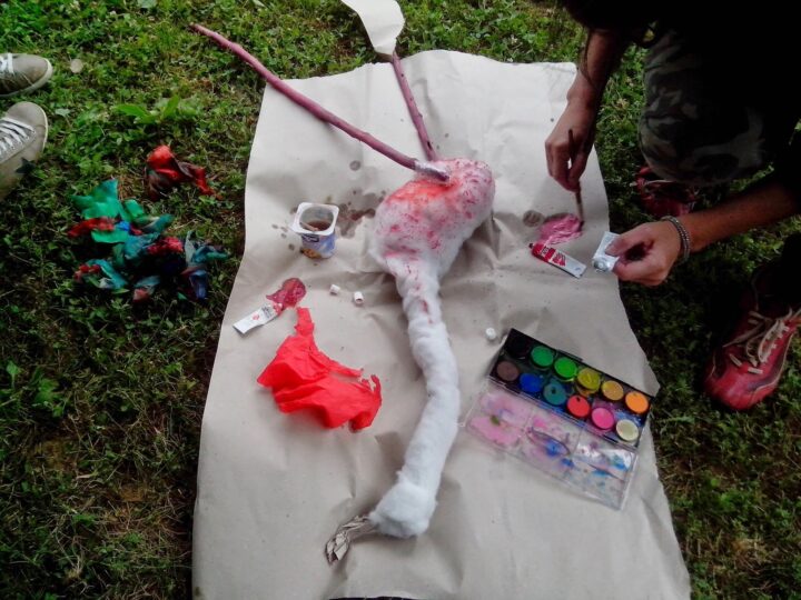 Tovább készültek AZ ÁLOM bábelemei. Látható formát öltött a kroki és az ejtőernyő, csillog már a víztükör és a vízesés is kész, a tündérrózsa tökéletes, a fehér flamingókából lassan rózsaszín lesz. A nagylányok kroki–focipályája a játékosokkal együtt meccsre vár.