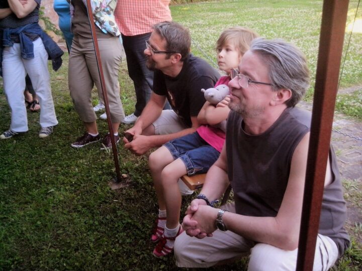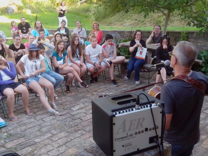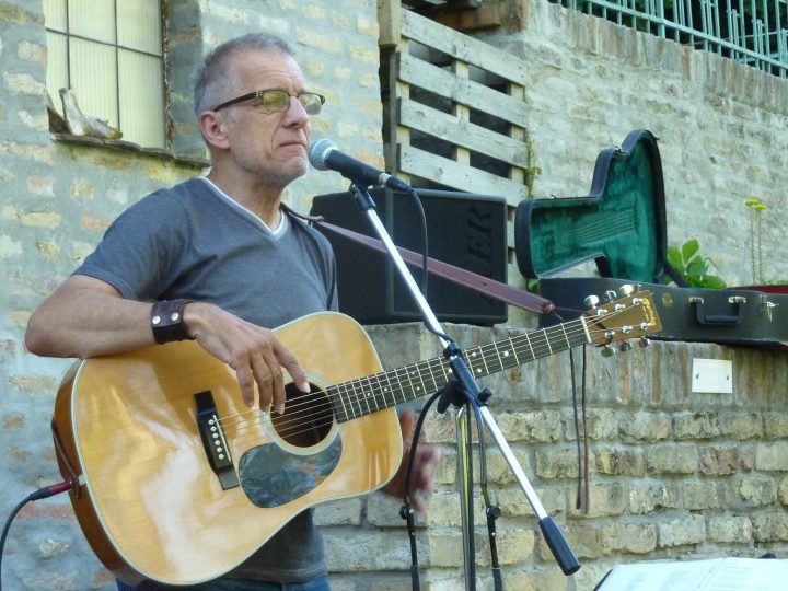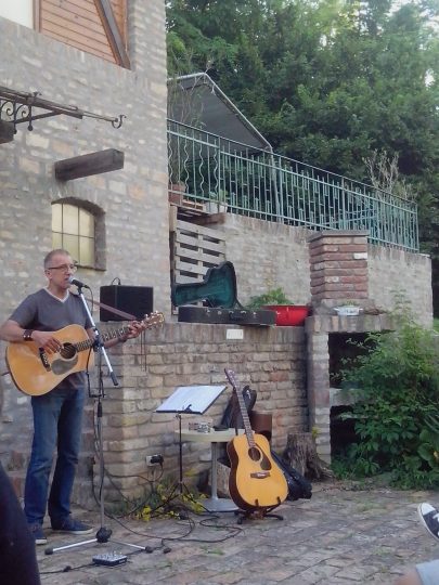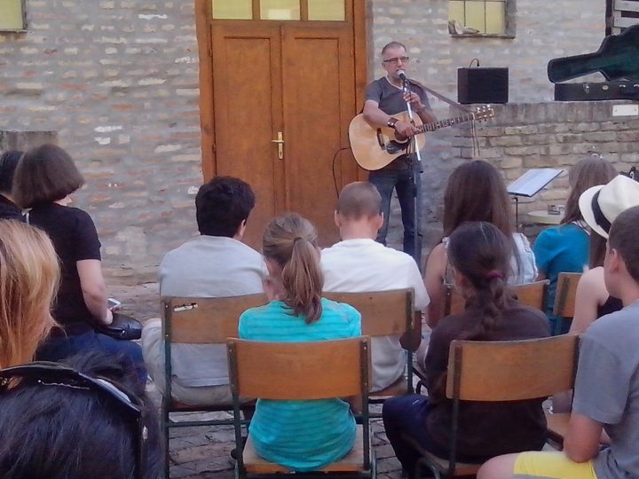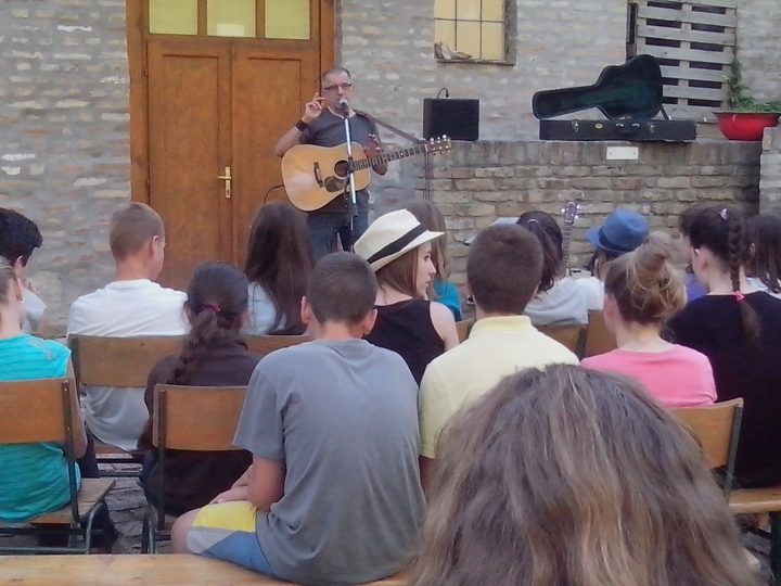 Nem a mi produkcióink voltak az este egyetlen csúcspontja. HUZELLA PÉTER, Kossuth-díjas zeneszerző, gitáros-énekes, a Kaláka, majd a Neil Young Sétány (NYS) formáció tagja adott műsort nekünk, mellyel a nap felhőtlenül boldogan zárult. (Megjegyzem, jóval korábban érkezett, és őt is lenyűgözte az, amit itt látott: Orbán Gyuri bácsi előadása és a mi csoportbemutatóink.)