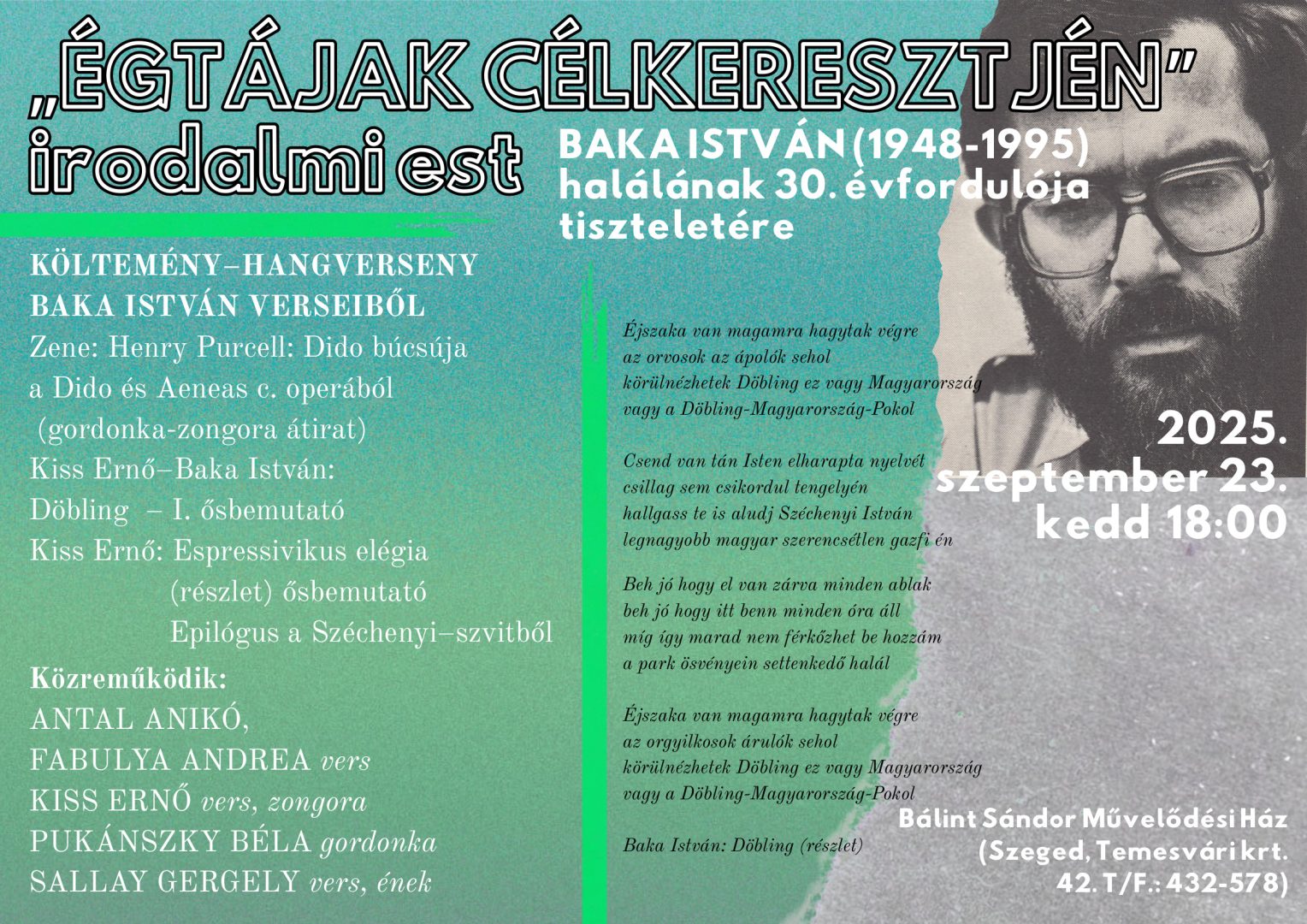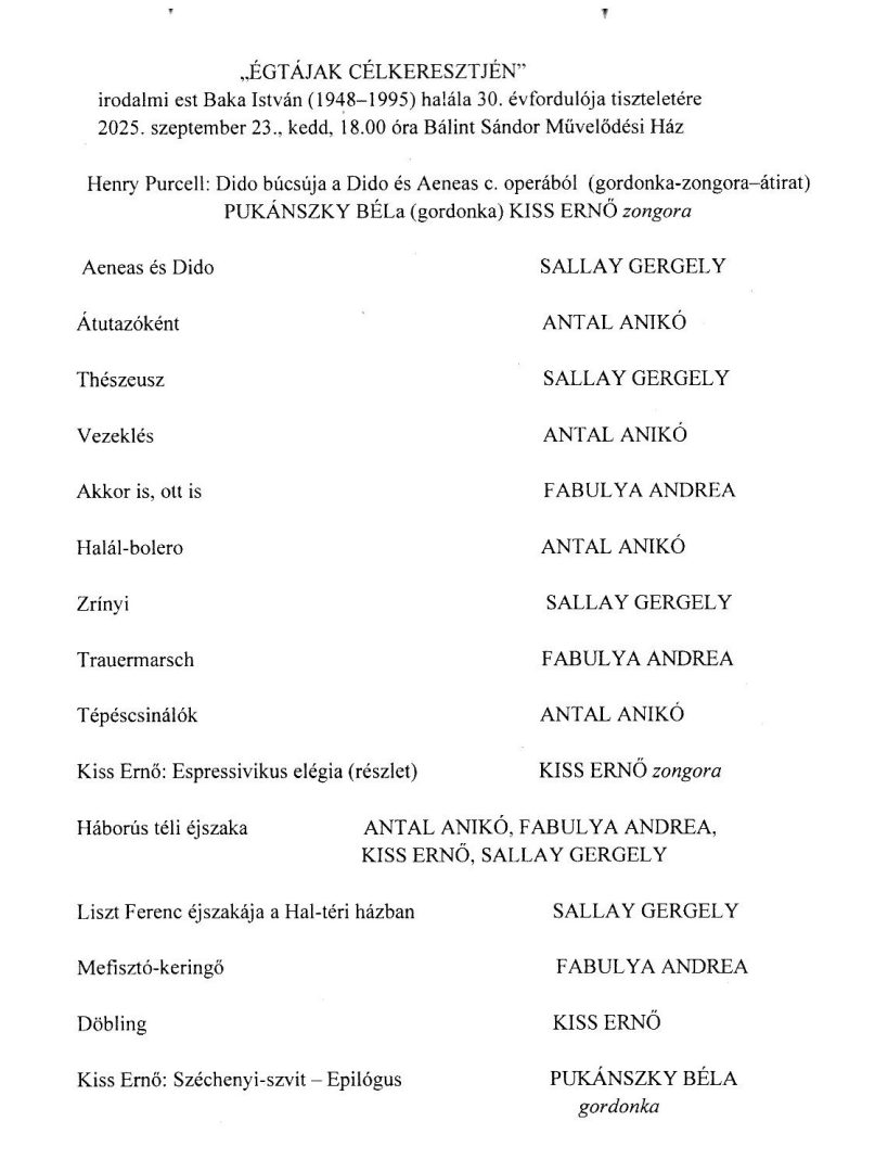 Megrendítő költemény-hangversenyt rendeztek Baka István emlékére Szegeden, a Bálint Sándor Művelődési Házban. A szervezés, muzsikálás és versmondás mellett köszönjük Kiss Ernőnek odaillő, visszafogott, szép zenéit is.